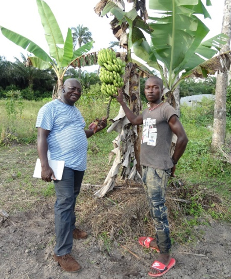 Edy Mando (links) vom Kindernetzwerk Sierra Leone e.V. und ein Mitarbeiter der Lehrfarm prüfen Bananen